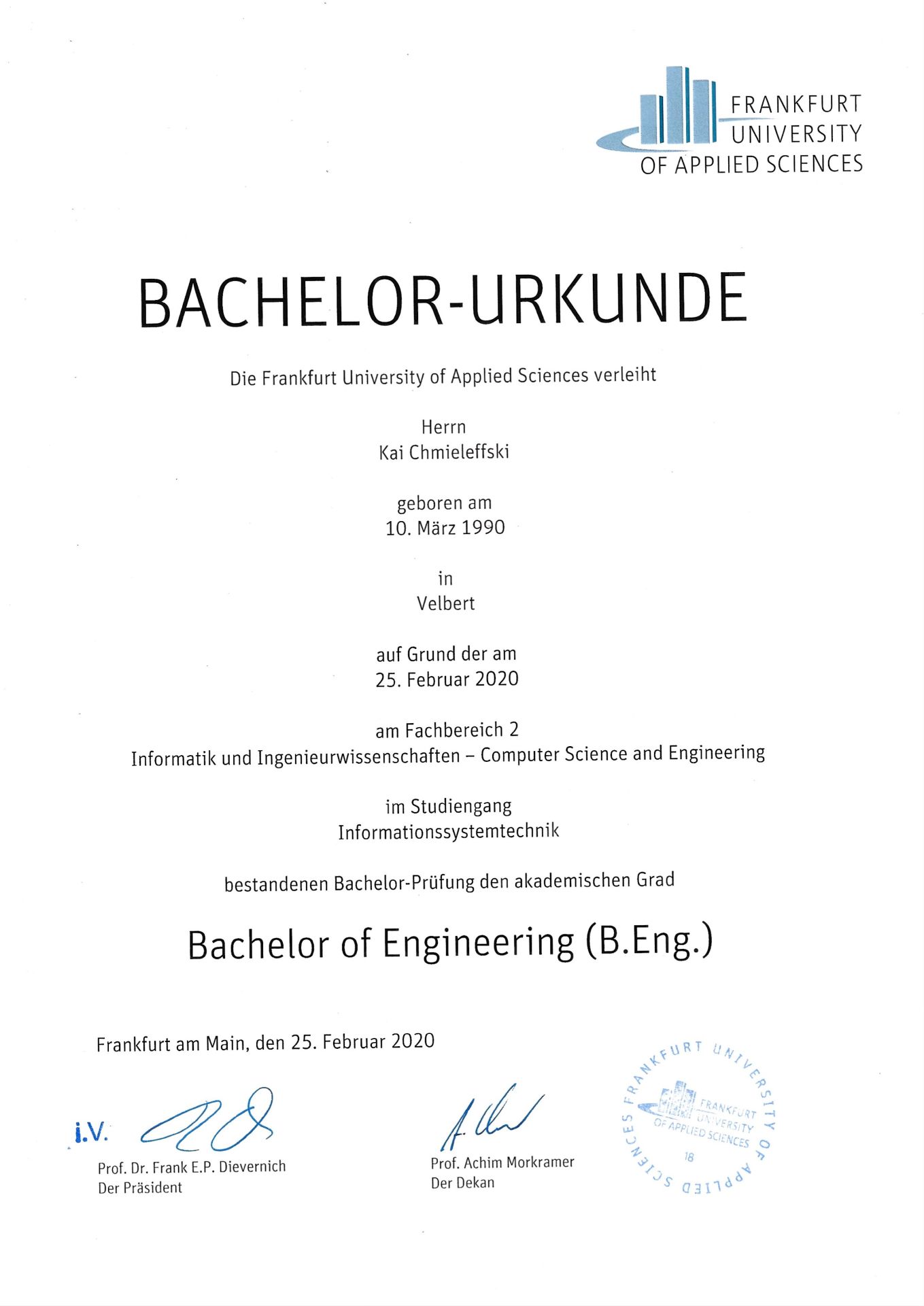 Ich beendete das Studium im Februar 2020 mit dem Titel Bachelor of Engineering. Die Bachelorarbeit wurde mit 1.0 bewertet, die Durchschnittsnote über alle Kurse beträgt 2.0. Während des Studiums gründete ich PDI.Engineering.