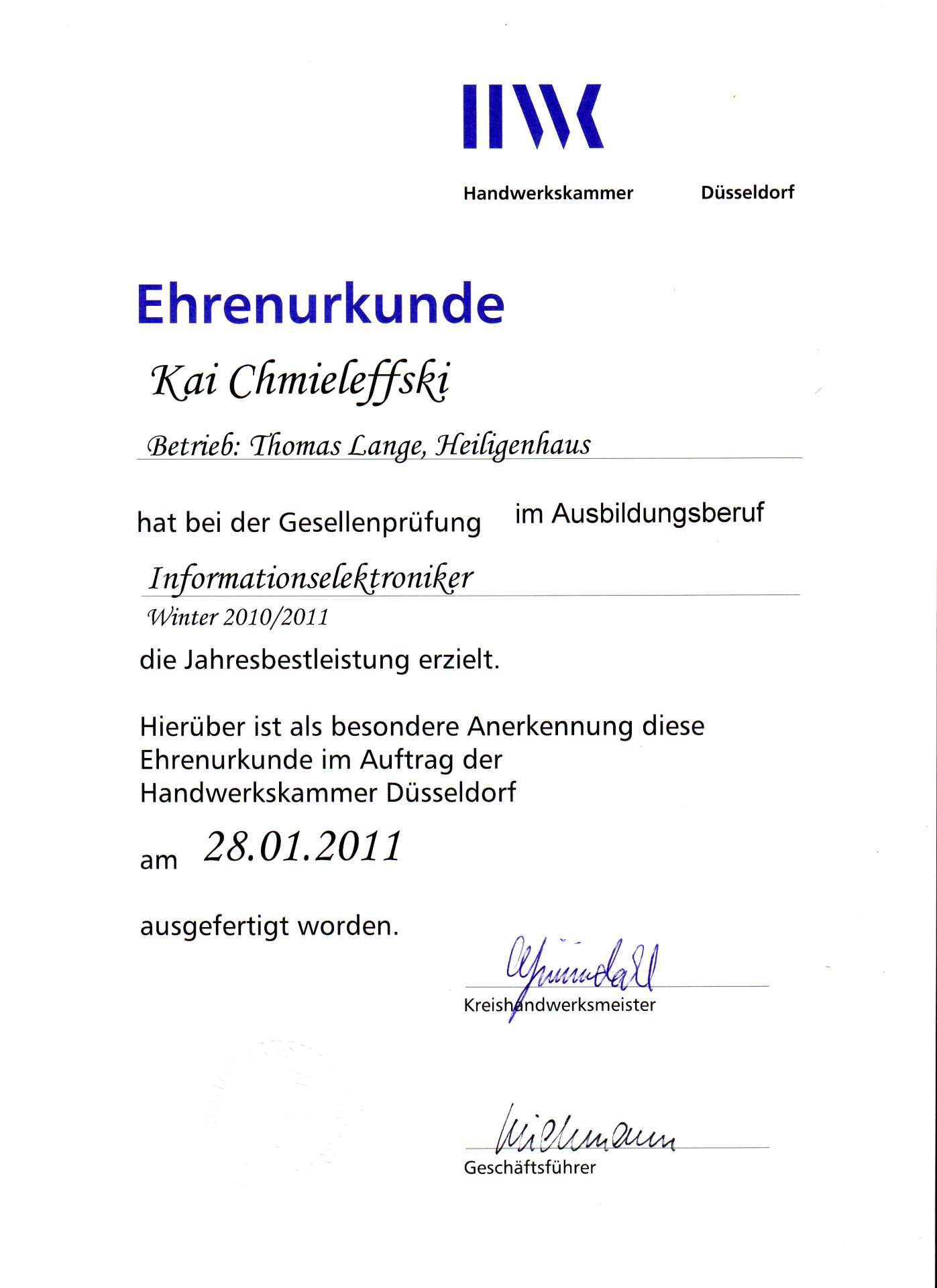 Meine Ausbildung als Informationselektroniker schloss ich 2011 ein Jahr früher als geplant ab, da es mir möglich war, die Ausbildung aufgrund guter Leistungen zwei mal zu verkürzen. Ich wurde zudem mit der Jahresbestleistung ausgezeichnet.